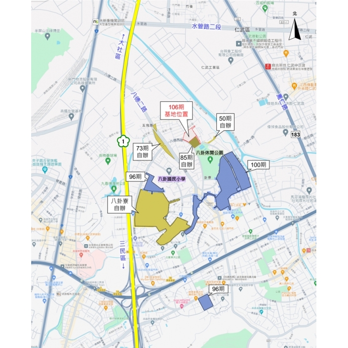 本重劃區位處本市仁武區,鄰近96期、100期等公辦市地重劃區,以及50期、73期、85期、八卦寮等自辦市地重劃區,足見本重劃區周遭發展潛力。重劃區用地現況使用為部分農業區及部分空地,藉由都市計畫變更及公辦重劃,打造住宅區鄰里性及兒童遊樂場使用,並透過道路及廣停開闢完善鄰近交通,將住宅區融入周邊住宅視覺景觀,兒童遊樂場及綠地更能提昇舒適生活環境。